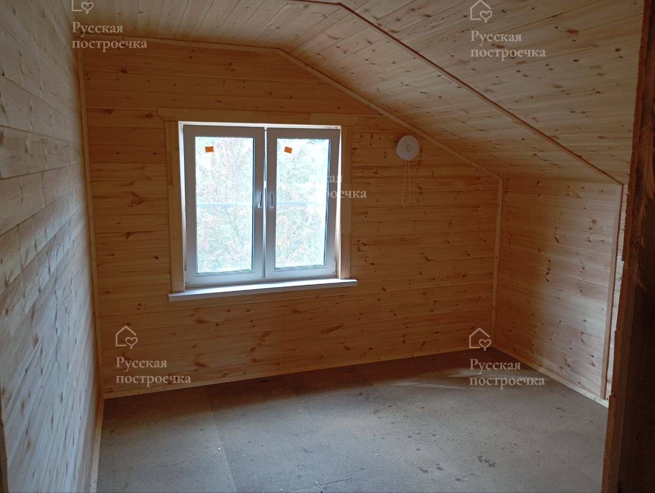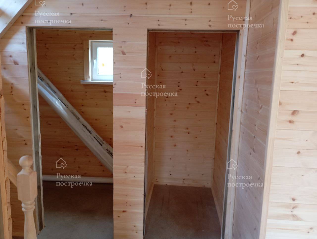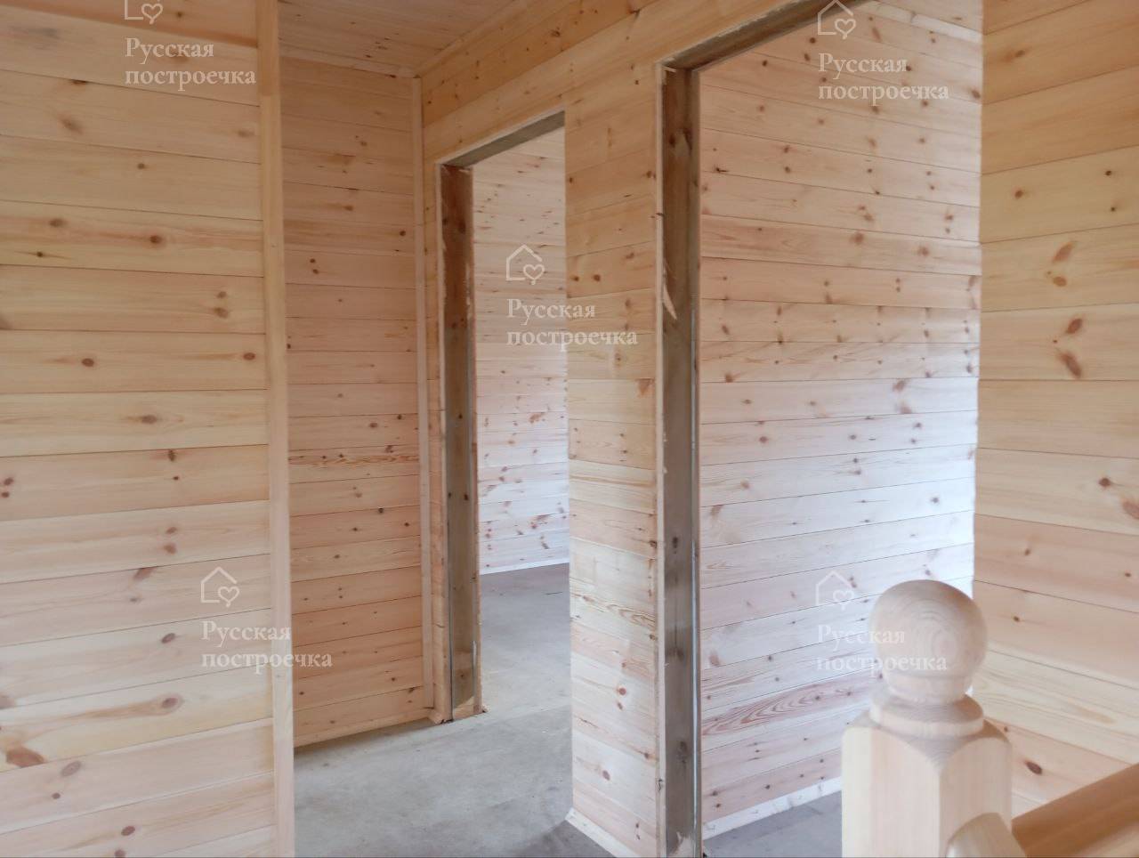 Фасад обшили имитацией бруса 18х140 мм камерной сушки, а внутренние стены — имитацией бруса 13х120 мм. Полы утеплены в 200 мм, по верху — шпунтованные плиты ДСП QuickDeck Professional 16 мм, в санузлах и котельной — листы ЦСП.