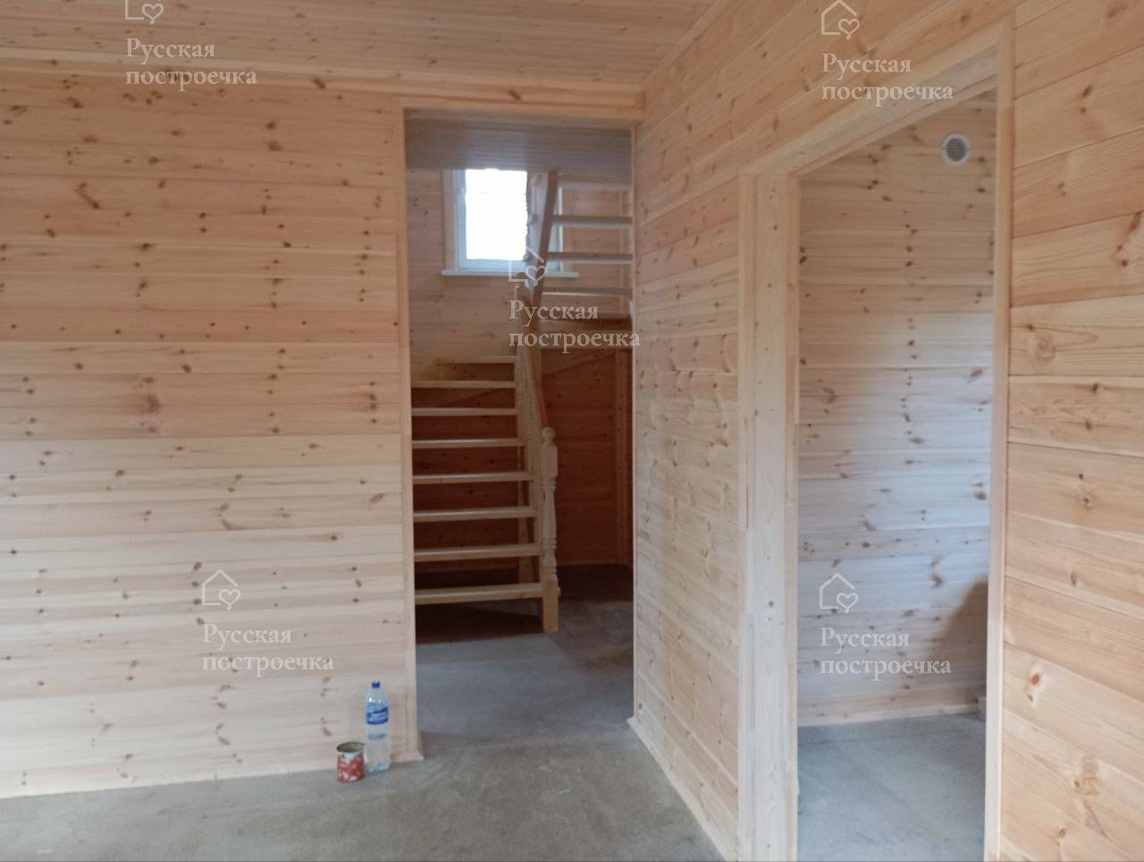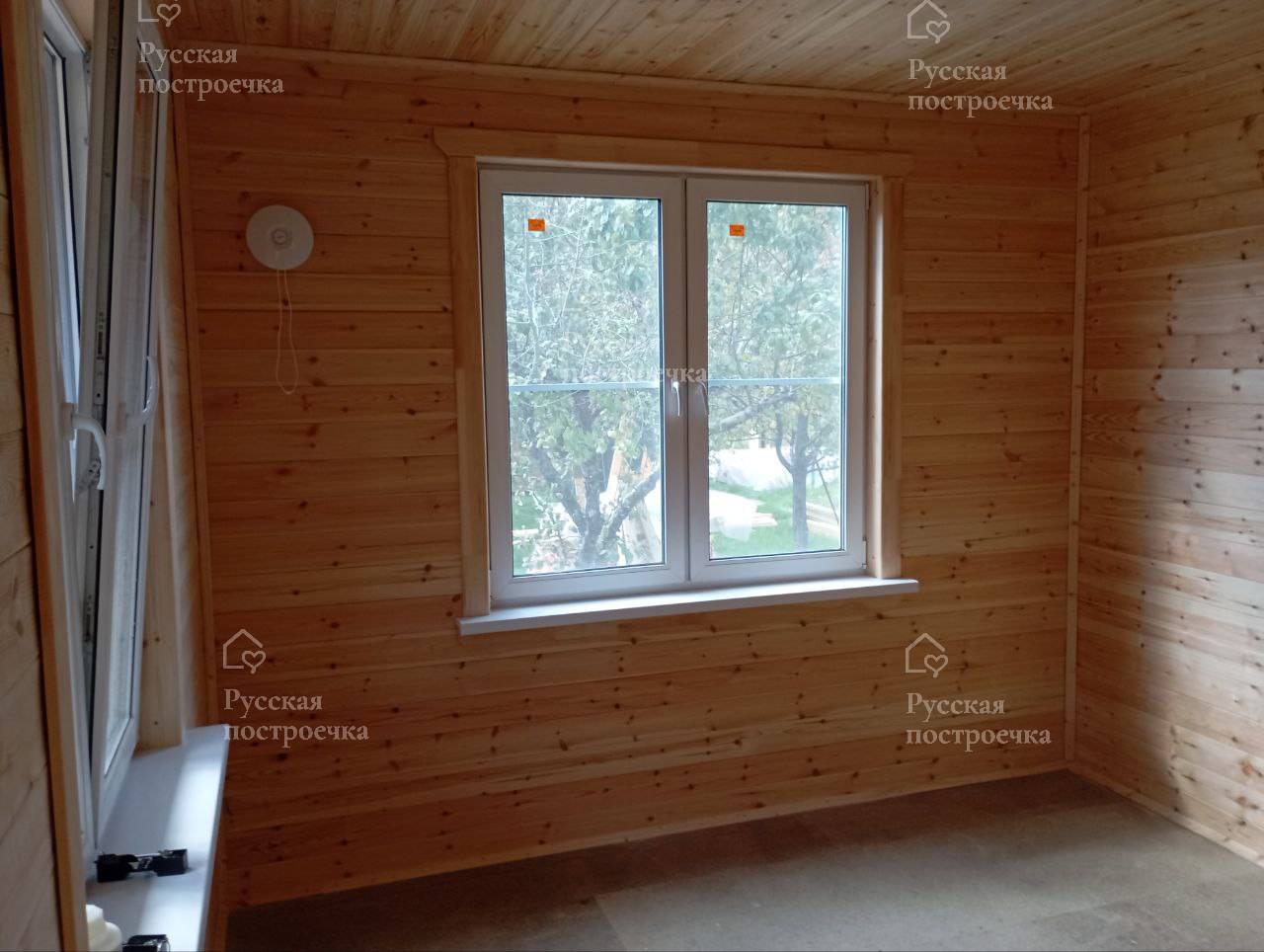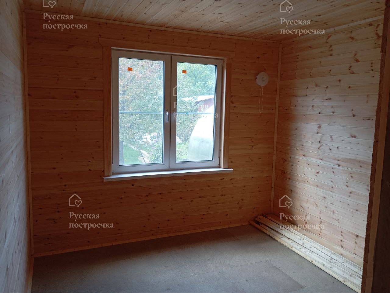Фасад обшили имитацией бруса 18х140 мм камерной сушки, а внутренние стены — имитацией бруса 13х120 мм. Полы утеплены в 200 мм, по верху — шпунтованные плиты ДСП QuickDeck Professional 16 мм, в санузлах и котельной — листы ЦСП.