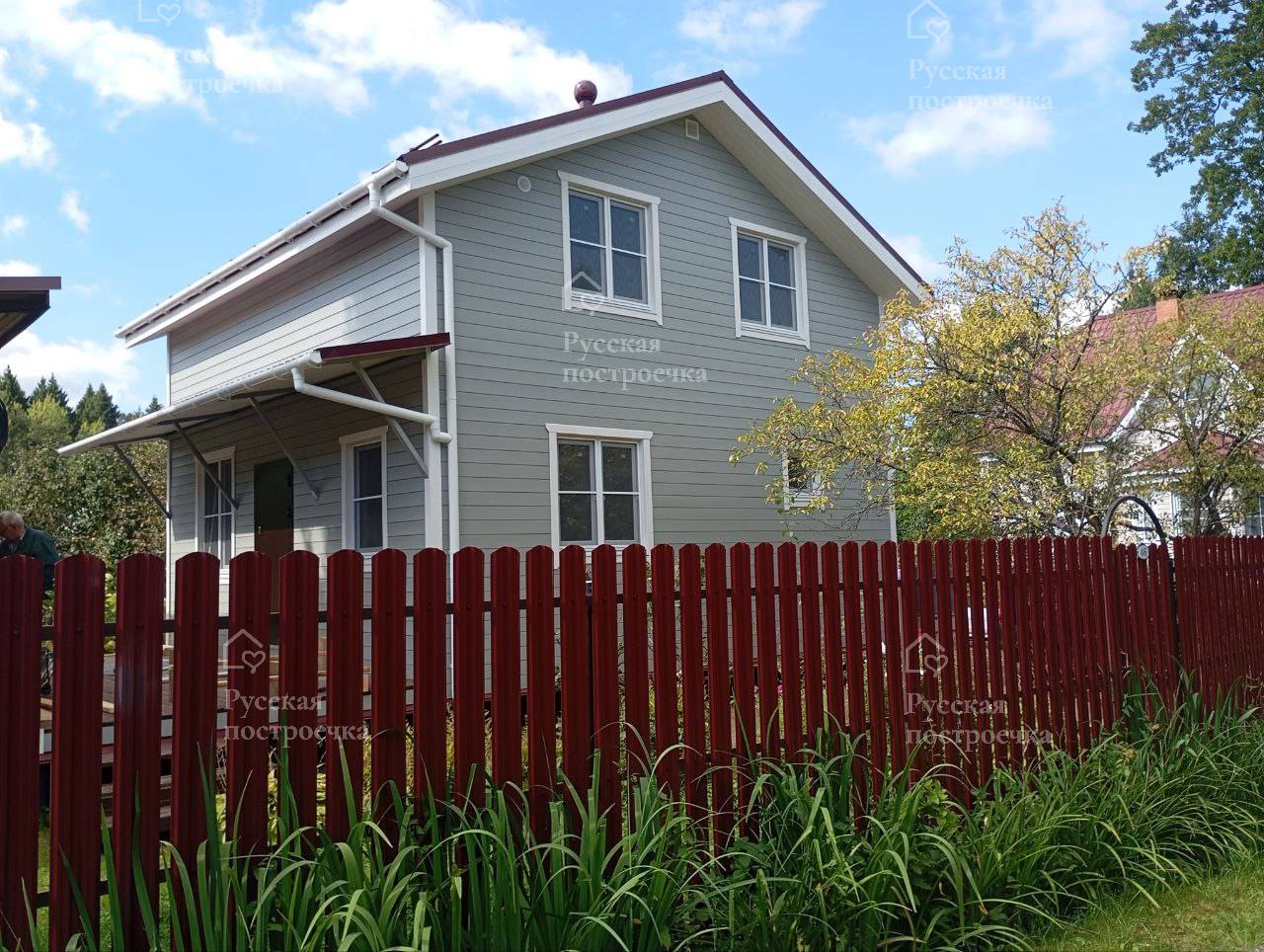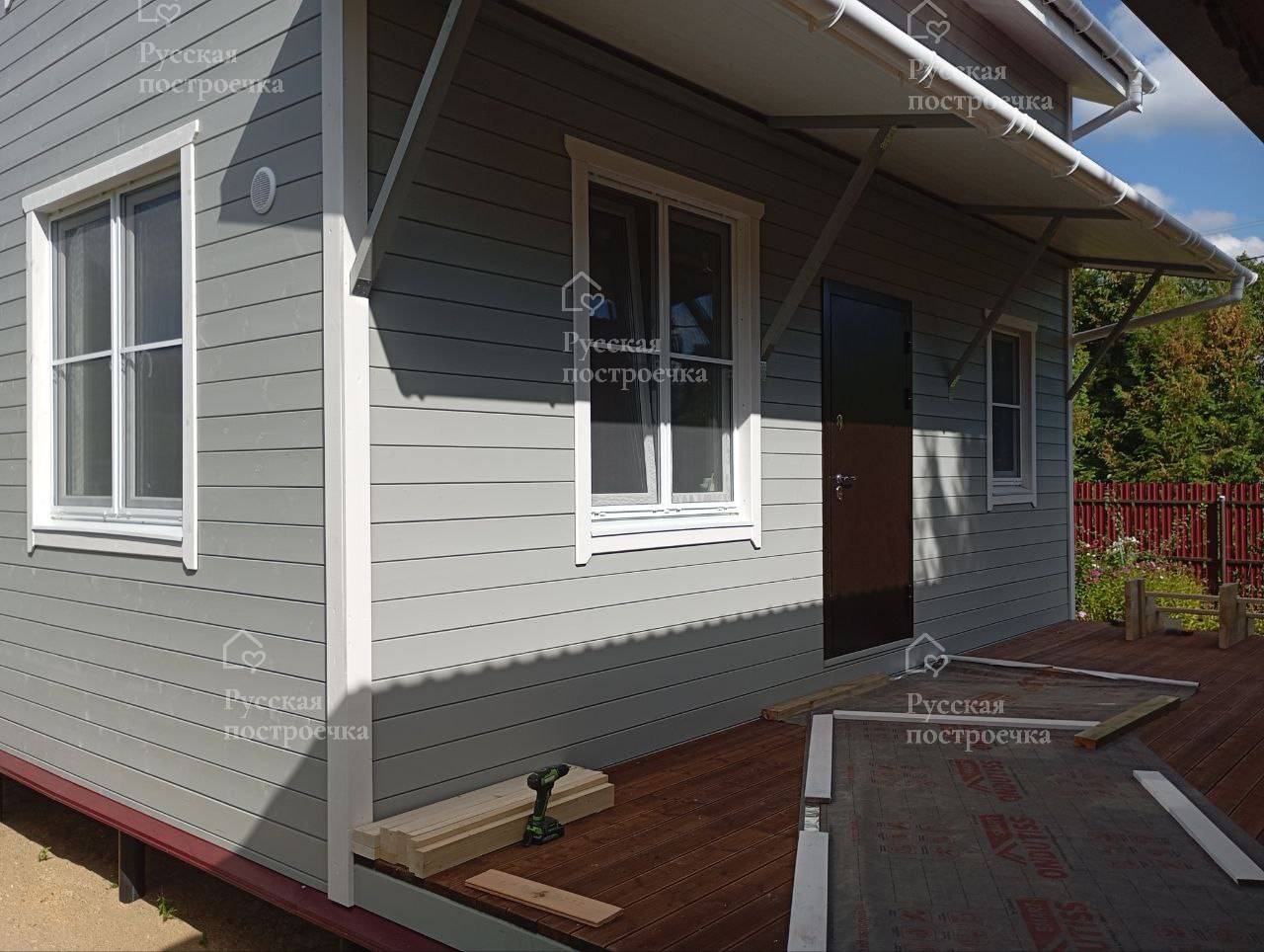 Окна ПВХ белого цвета, входная дверь металлическая 2,0×0,9 м, кровля — металлочерепица «RAL 3005 красное вино». Вдоль фундамента латается металлическая сетка от грызунов, установлена система водостока и снегозадержания.
