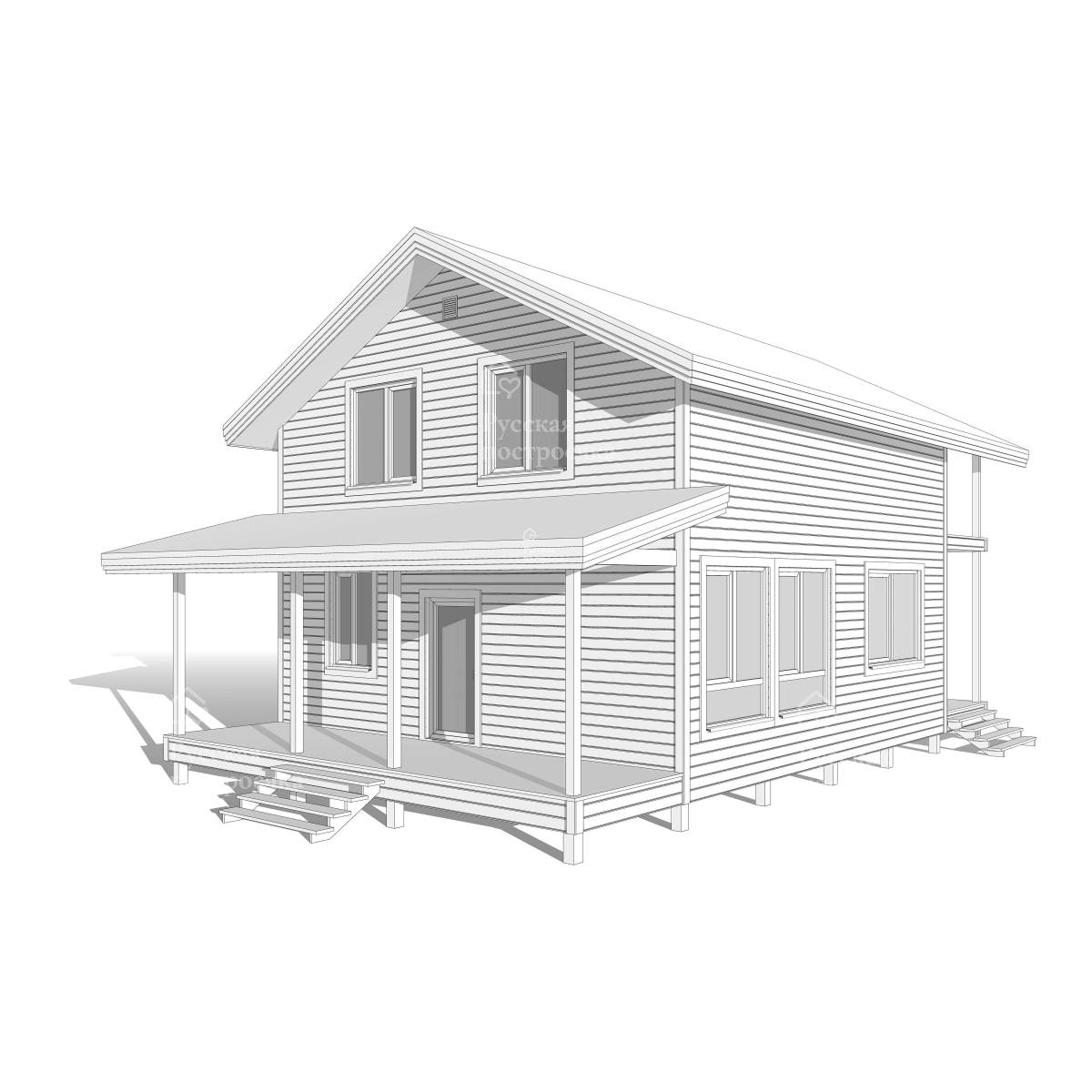 По каркасу уложена ветрозащитная плита «Белтермо 20 мм», затем обшивка имитацией бруса 18×140 мм. Внутренняя чистовая отделка отсутствует, утепление 150 мм каменной ватой «ROCKWOOL КАРКАС БАТТС», полы утеплены в 200 мм и закрыты шпунтованными плитами ДСП QuickDeck Professional 16 мм.