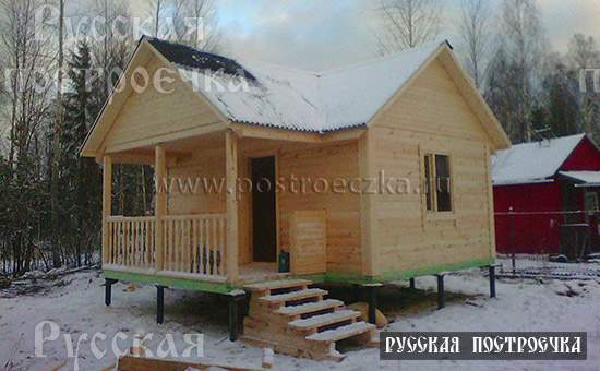 Одноэтажный дом из бруса вмещает две раздельные комнаты одинаковой площади: проходную кухню и изолированную спальню. Трехфронтонная крыша и терраса с декоративным ограждением украшают постройку и делают строение более функциональным. Прямоугольная терраса расширяет полезное пространство и может использоваться вместо беседки.