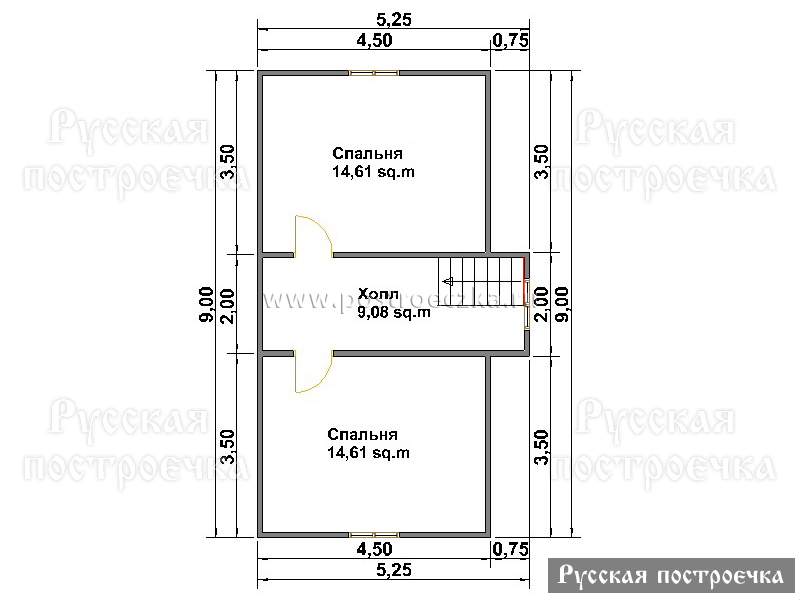 Просторный дом из бруса 9 на 6 по проекту 79 подойдет для постоянного или сезонного проживания. Общая площадь строения – 96 кв. м. Проектом предусмотрен полноценный первый этаж и мансарда. На первом этаже находятся пять помещений – кухня, санузел, холл, гостиная и спальня. На мансардном этаже расположены две спальни одинаковой площади (14,61 кв.м.), разделенные холлом.